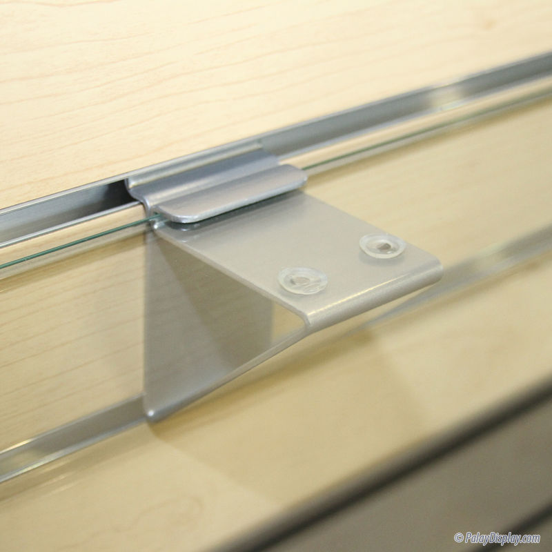 Floating silver slatwall shelf bracket for 3/16" tempered glass shelving only. Designed to display 3/16" tempered glass shelving on slatwall while styling a minimalist look. The 2 silicon bumpers serve as suction cups to hold up to 12" deep glass shelving securely in place. The silver slatwall shelf bracket works with 3/16" thick tempered glass shelving only.